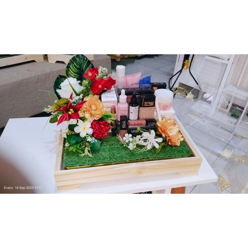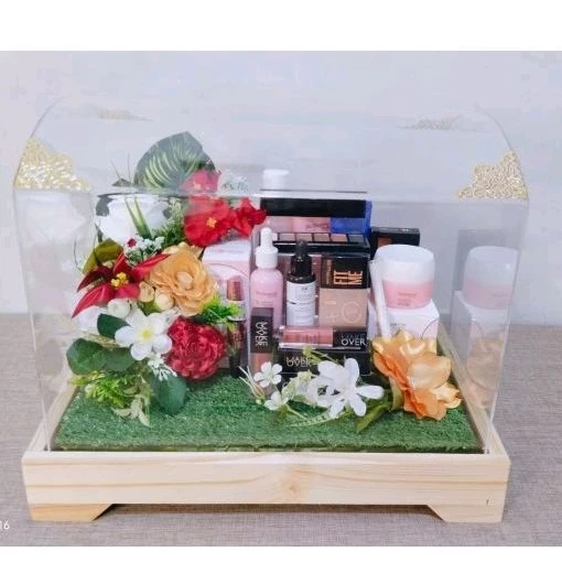 Tutup Akrilik Bening: Jauh lebih mewah dan aman dibandingkan plastik mika biasa, memberikan kesan eksklusif seperti etalase perhiasan, serta melindungi isi hantaran dengan maksimal.